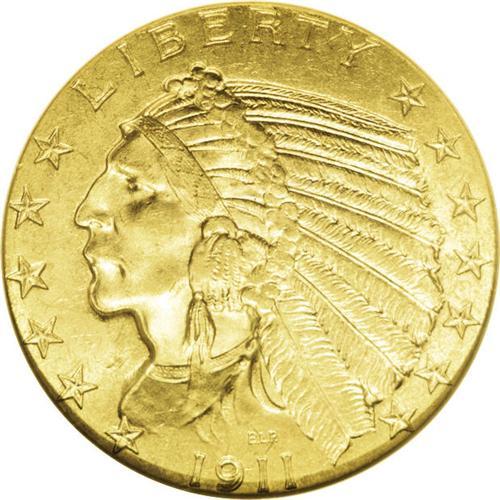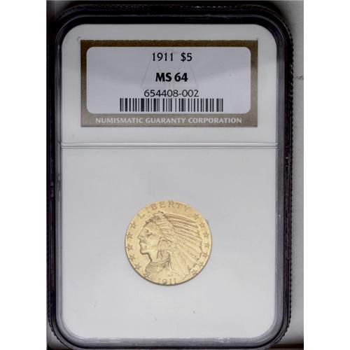 <B>1911<$5> MS64 NGC.</B></I> The 1911 is one of the more common issues of the type, and examples in the lower Mint State range are available with some regularity. Near-Gems present a bit more of a challenge, but are available with patience. Gems and better are scarce. The present MS64 coin displays lustrous, honey-gold surfaces and adequately struck motifs. The Indian's cheek is fairly clean, while a few handling marks in the fields define the grade. NGC has certified 36 specimens finer (3/06). <BR><BR><B>Important notice:</B> Heritage usually auctions material at the rate of 200-250 lots per hour. On some occasions eBay Live bid software or the Internet may not be able to keep up with the pace of the auction. We recommend placing a realistic absentee bid now as insurance to avoid disappointment. Occasionally the auctioneer may eliminate or reject an eBay Live bid, and the auctioneer may also reopen a lot after the close of the eBay live bidding (usually because we missed an audience bid), and may reject your bid even if it shows you as the winning bidder. By bidding via eBay Live, you agree that Heritage may award the lot to another bidder at its sole discretion under the circumstances described above or any other reasonable circumstances. Since eBay bids are not shown to us until we open the lot on the floor, we treat those bids just like floor bids. In most cases the floor responds before the eBay bid is presented to us, due to Internet lag time, so for consistency we have made it a policy that floor bids are always considered first over tie eBay live bids. Also please note that all Heritage lots purchased through eBay Live carry a 20% Buyer's Premium. Please make sure you read the Terms and Conditions before you bid. This lot is being auctioned in conjunction with a live floor auction by Heritage Galleries & Auctioneers. All final auction and invoice information will be supplied by Heritage Galleries & Auctioneers, and all other information should be considered preliminary. Lot:2890 <BR><BR><B>Winning Notification and Billing:</B> After the FINAL session in this auction is complete, Heritage will send e-mail and snail mail invoices. This process normally takes several days. All final auction and invoice information will be supplied by Heritage Galleries & Auctioneers, and all other information should be considered preliminary. <BR><BR>This auction will be conducted on a live auction floor and over the Internet through eBay Live. If you choose to place an absentee bid, please take a moment to <font color='#0000ff'><u><a href='http://pages.ebay.com/liveauctions/help/before/laabsentee.html'>learn how eBay Live absentee bidding works</a></u></font><font color='#000000'>