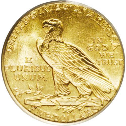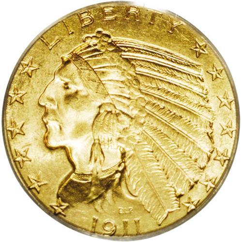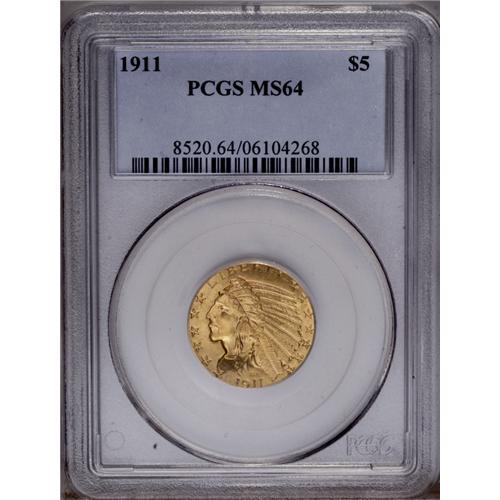 <B>1911<$5> MS64 PCGS.</B></I> A highly lustrous and minimally abraded example of this more common Indian half eagle. Golden-tan color abounds over each side. The strike wanes slightly over a couple of selected points, the grade-limiting factor. Still, a superior type coin.