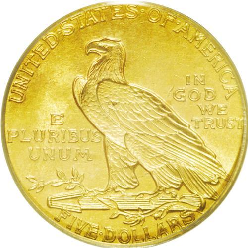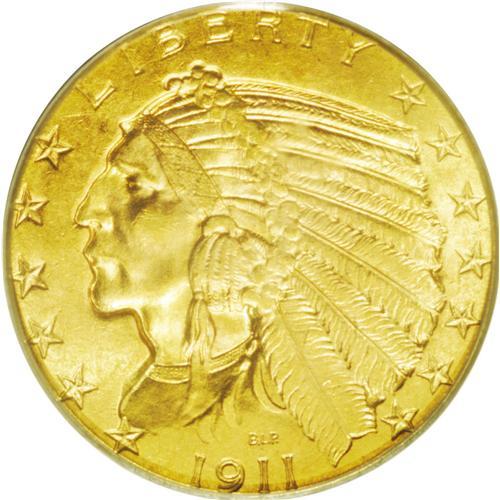 <B>1911<$5> MS64 PCGS.</B></I> Extremely close to Gem quality, with just a few minute obverse contact marks preventing that designation. The surfaces are a beautiful, satiny antique-gold, with scintillating luster and no obvious distractions. This issue becomes quite elusive at the Gem level, where PCGS has graded only 42 pieces finer than the present example (5/06).