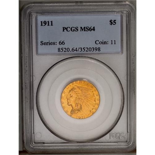 1911 $5 MS64 PCGS. Extremely close to Gem quality, wit 1911