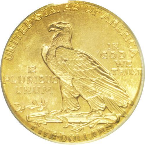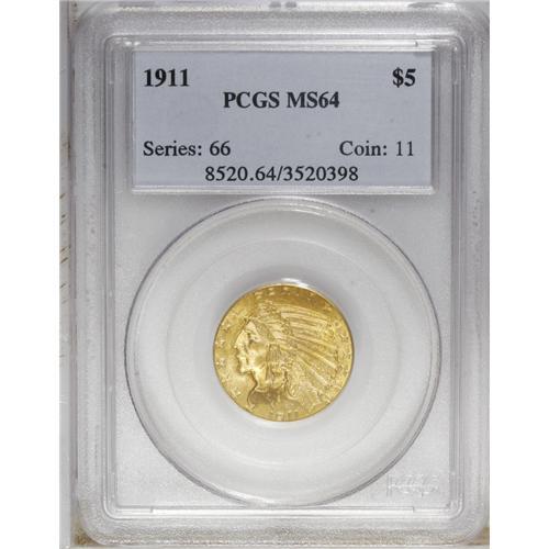 <B>1911 $5 MS64 PCGS.</B></I> Extremely close to Gem quality, with just a few minute obverse contact marks preventing that designation. The surfaces are a beautiful, satiny antique-gold, with scintillating luster and no obvious distractions. This issue becomes quite elusive at the Gem level, where PCGS has graded only 44 pieces finer than the present example (10/06).<BR><BR><b>Shipping:</b> Coin/Currency (<a target="_blank" href="http://www.heritageauctions.com/common/shipping.php">view shipping information</a>)