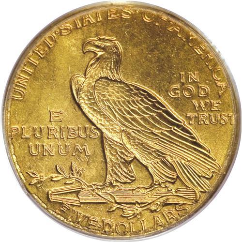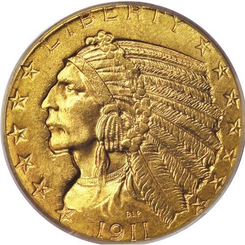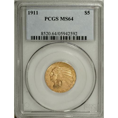 <B>1911 $5 MS64 PCGS.</B></I> This fortunate survivor from a plentiful mintage is afflicted with neither the poor luster nor the strike weakness seen on many examples of the issue. On the contrary, radiant luster emanates from the fine-grained, mattelike deep orange-gold surfaces, and there is no mentionable deficiency on the headdress feathers, nor indeed on any other design feature. While a couple of stray contact marks remove this piece from Gem consideration, the eye appeal is strong and the piece appears high-end for the grade.<BR><BR><b>Shipping:</b> Coins & Currency (<a target="_blank" href="http://www.heritageauctions.com/common/shipping.php">view shipping information</a>)