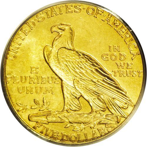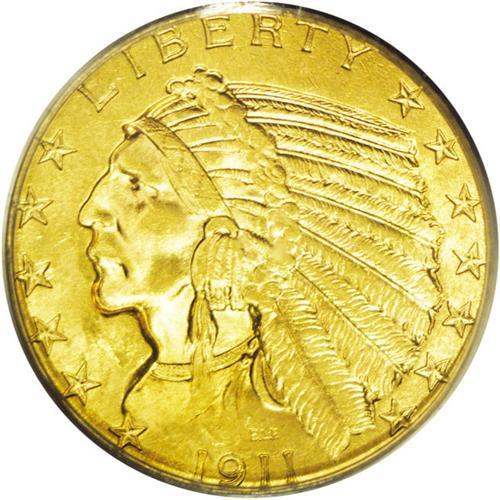 <B>1911<$5> MS64 PCGS.</B></I> This is a stunning near-Gem example that would easily qualify at a higher grade level except for the presence of a small scrape below the chin. Both sides have brilliant luster with rich honey-gold color. This is an important offering that will appeal to either the date collector or the type collector.