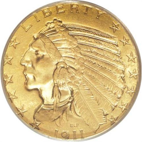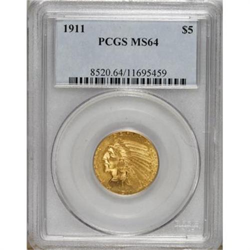 <B>1911 $5 MS64 PCGS.</B></I> The rich, satiny luster of this 1911 quarter eagle seems commensurate to a higher grade. However, close examination of the obverse reveals a thin scratch on the Indian's headdress. This minor flaw is perhaps the only distraction precluding this example from a Gem designation. PCGS has assigned higher grades to only 44 pieces.<BR><BR><b>Shipping:</b> Coins & Currency (<a target="_blank" href="http://www.heritageauctions.com/common/shipping.php">view shipping information</a>)
