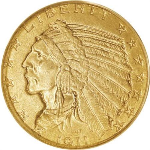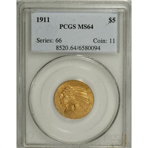 <B>1911 $5 MS64 PCGS.</B></I> This near-Gem 1911 half eagle displays better-than-average strike, particularly on the headdress feathers, an area than typically is ill defined on the issue. Orange-gold patina is tinted with light green, and rests over soft luster. A few inoffensive handling marks define the grade. Challenging and very scarce any finer despite a sizable mintage of 915,000 pieces.<BR><BR><B>Coin Engraver:</B> Bela Lyon Pratt<BR><BR><b>Shipping:</b> Coins & Currency (<a target="_blank" href="http://www.heritageauctions.com/common/shipping.php">view shipping information</a>\)