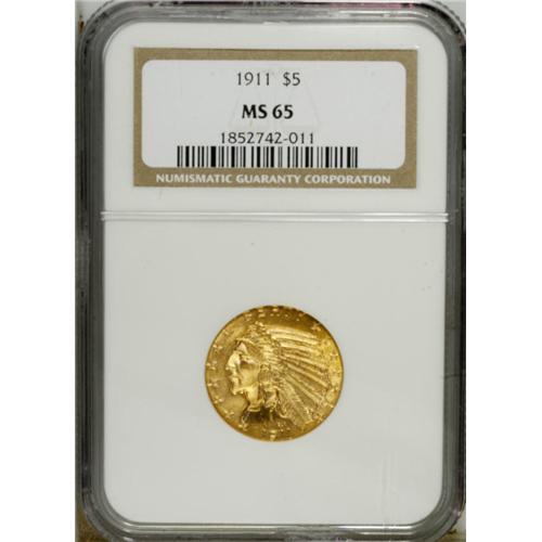 <B>1911 $5 MS65 NGC.</B></I> This pleasing honey-gold Gem has vibrant luster and unmarked surfaces. The strike is assertive and the eye appeal is undeniable. Few collectors concentrated on 20th century gold coins until the 1940s. A 1911 half eagle, with a mintage of more than 900,000 pieces, was valued strictly for its bullion content for many years. Pieces were loosely stored, and many participated in Roosevelt's gold recall. The 1911 is seen in Mint State, but usually in MS61 to MS63 grades. NGC and PCGS have each certified only a single example finer. Census: 36 in 65, 1 finer (1/07).<BR><BR><b>Shipping:</b> Coins & Currency (<a target="_blank" href="http://www.heritageauctions.com/common/shipping.php">view shipping information</a>)