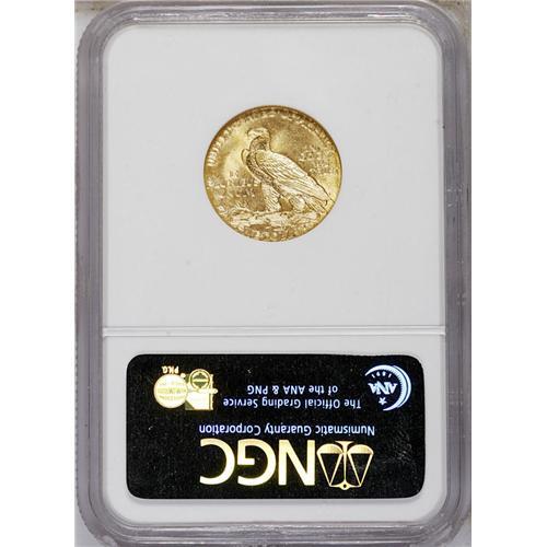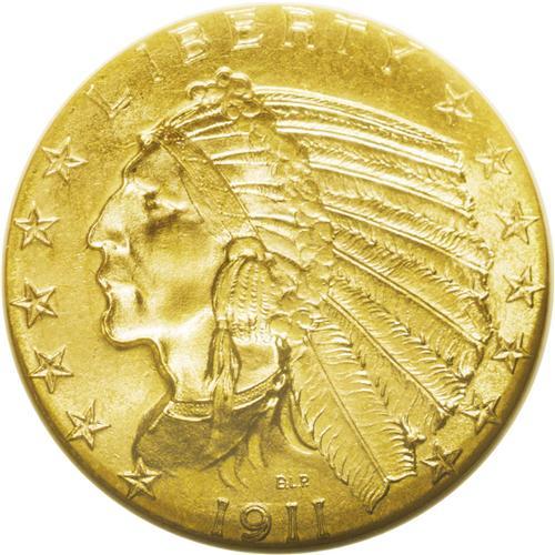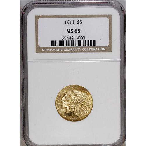 <B>1911<$5> MS65 NGC.</B></I> While the 1911 is one of the more commonly encountered dates in the series, it is surprisingly elusive in Gem condition. Only 35 pieces have been so graded by NGC with only one finer (7/06). This is an especially attractive example that has bright copper-gold surfaces and coruscant, satiny luster with a somewhat matte-like finish. Sharply struck throughout. As one might imagine, there are no obvious abrasions on either side.