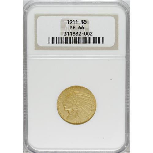 <B>1911 $5 PR66 NGC.</B></I> This is a finely grained Gem matte proof example with the usual mustard-yellow color of the date, accented by hints of pale orange toning on each side. The surfaces are mostly free of blemishes, rendering pedigree tracking nearly impossible, although a tiny copper spot is positioned northwest of the G in GOD on the reverse. The mintage of this issue is recorded as 139 pieces in matte proof, and the number that survive is not specifically known today, although a realistic quantity might be 70 to 80 pieces. Any attempt to track pedigrees of matte proof gold through the usual process of plate matching in past auction catalogs is a futile effort, even if the quality of photographic reproduction is excellent. Seldom do examples show any individual characteristics that can be matched from one appearance to the next. Census: 16 in 66, 12 finer (3/07).<BR><BR><b>Shipping:</b> Coins & Currency (<a target="_blank" href="http://www.heritageauctions.com/common/shipping.php">view shipping information</a>)