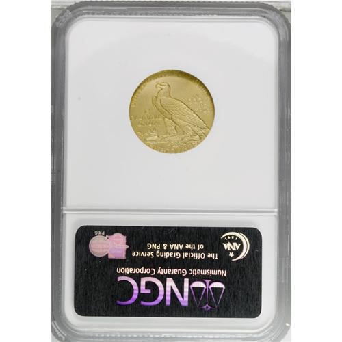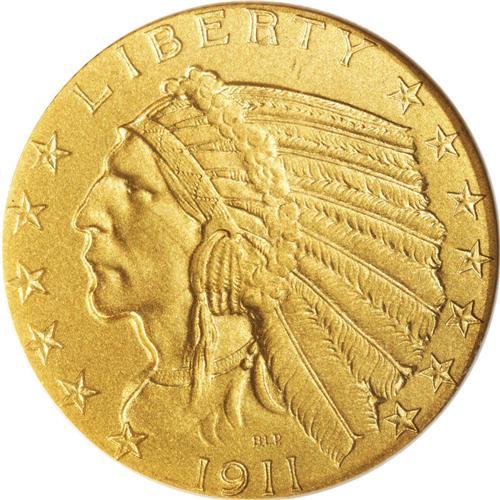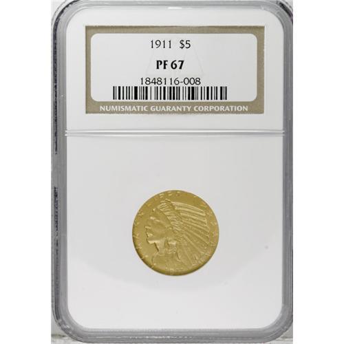 <B>1911 $5 PR67 NGC.</B></I> A mere 139 proofs were struck in 1911, a considerable drop (on a percentage basis) from the 250 proof half eagles produced in 1910. Probably, the contemporary demand for both proof issues was similar, but the Mint had 1910 remainders, and accordingly reduced the 1911 mintage. If so, this would be similar to the behavior of Mint between 1861 and 1862, when mintages of proof silver coins fell from 1,000 pieces to 550 pieces, yet the 1862 proofs are actually more plentiful, since fewer were condemned to a Treasury smelter. Breen states on page 502 of his 1988 <I>Encyclopedia,</B></I> "many were melted in 1916 as unsold," referring to prior proof dates of Indian quarter eagles. The comment may hold true for several dates of the proof Indian half eagle, as well. The mintages of the matte finish proofs vary significantly from year to year, with a high of 250 pieces in 1910, and a low of 75 pieces in 1915. Yet the proof mintage for the 1914, at 125 pieces, is substantially higher than the 1909 mintage of 78 pieces. Silver proof mintages generally fell during these years. No conclusion can be made regarding the popularity of the matte proof finish based on these mintage figures.<BR> The present specimen is a remarkable Superb Gem. Thorough evaluation with the aid of a strong lens fails to locate any abrasions, and the matte finish is seamless save for a small, slightly darker area atop the eagle's beak. As expected from a proof striking, all design elements are penetratingly delivered. Ideal for the finest quality proof gold type set.<BR><I>Ex: Bowers and Merena, 5/04, lot 441.</B></I><BR><I>From The Dr. Robert J. Loewinger Collection.</B></I><BR><BR><b>Shipping:</b> Coin/Currency (<a target="_blank" href="http://www.heritageauctions.com/common/shipping.php">view shipping information</a>) <BR><BR><B>Import