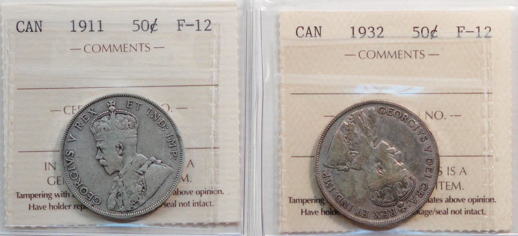 1911 50¢, 1932. Both coins ICCS Fine-12