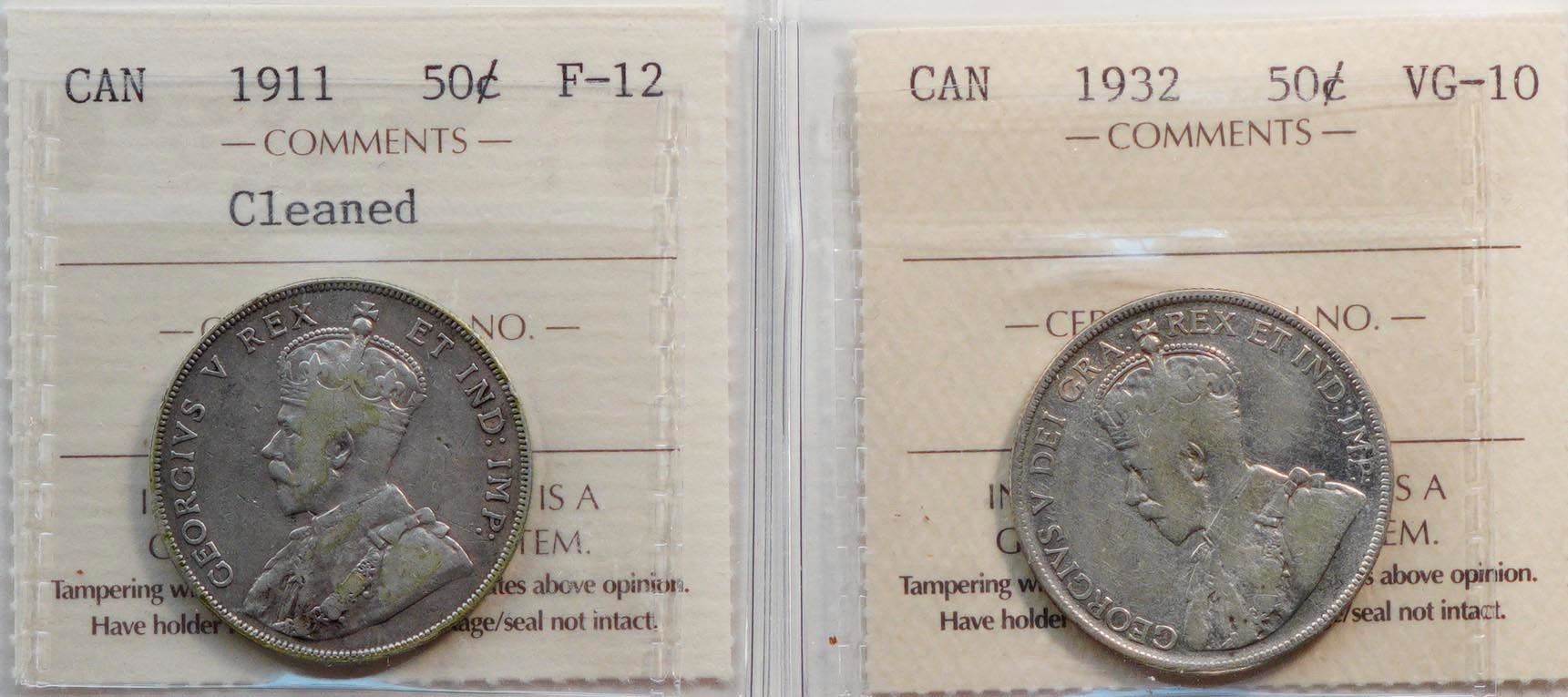 1911 50¢ ICCS Fine-12 Cleaned, 1932 ICCS Very Good-10. Lot of 2 coins