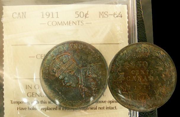 1911 50¢ ICCS MS-64 attractive toning over full underlying luster. Excellent strike with clean fields and great surfaces.