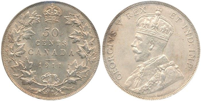 1911 50¢ ICCS MS65. Well struck with very clean fields. Tough key issue in high MS grades. Fully lustrous with golden tones on reverse, light gold and brown toning on obverse.