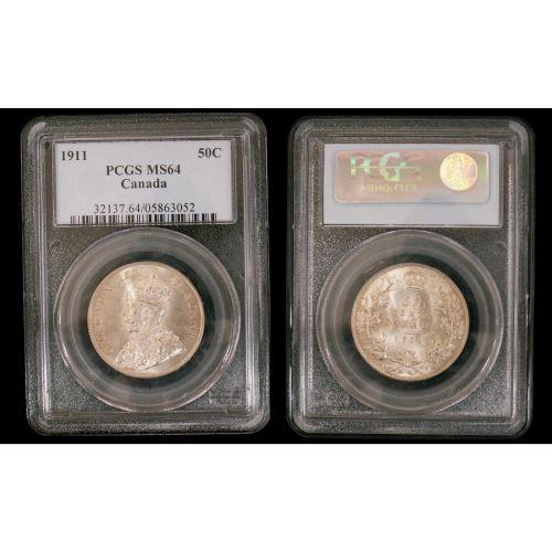 1911 50¢ PCGS MS64. An absolute near Gem example. Coin is cross graded ICCS MS64 but has the look of a 65. Flashy white in colour with gem fields and tremendous lustre. An absloute must see