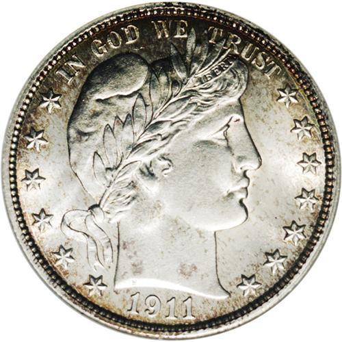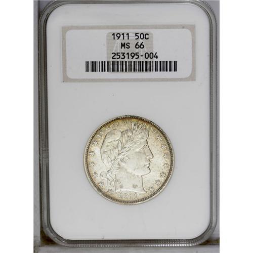 <B>1911<50C> MS66 NGC.</B></I> Over the past six months we have had the good fortune to offer several Premium Gem examples of this late-date Philadelphia issue, a rather healthy percentage of the entire certified population. However, it is doubtful that any of these beautifully preserved 1911 halves could exceed the strength of strike or vibrancy of this example. Speckled reddish-gold and steel-blue toning lightly frames each side. Census: 8 in 66, 1 finer (3/06). <BR><BR><B>Important notice:</B> Heritage usually auctions material at the rate of 200-250 lots per hour. On some occasions eBay Live bid software or the Internet may not be able to keep up with the pace of the auction. We recommend placing a realistic absentee bid now as insurance to avoid disappointment. Occasionally the auctioneer may eliminate or reject an eBay Live bid, and the auctioneer may also reopen a lot after the close of the eBay live bidding (usually because we missed an audience bid), and may reject your bid even if it shows you as the winning bidder. By bidding via eBay Live, you agree that Heritage may award the lot to another bidder at its sole discretion under the circumstances described above or any other reasonable circumstances. Since eBay bids are not shown to us until we open the lot on the floor, we treat those bids just like floor bids. In most cases the floor responds before the eBay bid is presented to us, due to Internet lag time, so for consistency we have made it a policy that floor bids are always considered first over tie eBay live bids. Also please note that all Heritage lots purchased through eBay Live carry a 20% Buyer's Premium. Please make sure you read the Terms and Conditions before you bid. This lot is being auctioned in conjunction with a live floor auction by Heritage Galleries & Auctioneers. All final auction and invoice information will be supplied by Heritage Galleries & Auctioneers, and all other information should be considered preliminary. Lot:2074 <BR><BR><B>Winning Notification and Billing:</B> After the FINAL session in this auction is complete, Heritage will send e-mail and snail mail invoices. This process normally takes several days. All final auction and invoice information will be supplied by Heritage Galleries & Auctioneers, and all other information should be considered preliminary. <BR><BR>This auction will be conducted on a live auction floor and over the Internet through eBay Live. If you choose to place an absentee bid, please take a moment to <font color='#0000ff'><u><a href='http://pages.ebay.com/liveauctions/help/before/laabsentee.html'>learn how eBay Live absentee bidding works</a></u></font><font color='#000000'>