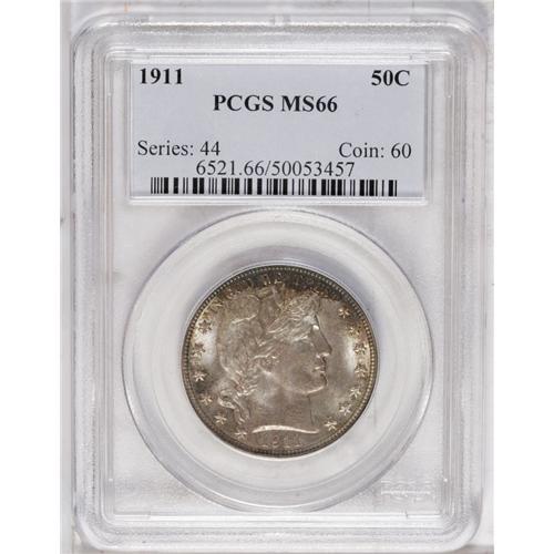 <B>1911<50C> MS66 PCGS.</B></I> Golden-russet coloration is moderate on the obverse, and light on the reverse, but both sides demonstrate undiminished cartwheel iridescence. This well preserved Premium Gem has barely a hint of striking softness near the right shield corner, but the strike is above average for the type. Population: 11 in 66, 0 finer (6/06).<BR><I>From The Belle Glade Collection.</B></I>