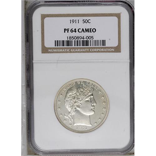 <B>1911<50C> PR64 Cameo NGC.</B></I> The eye appeal of this example is fully equal to many Gem PR65 examples we have seen. This one is essentially brilliant with a touch of gold toning over each side. The fields are deeply mirrored, and just a touch of hazy hairlines prevents the elusive Gem determination. The devices are bright and lustrous with a frosty appearance and just miss a designation of Deep or Ultra Cameo.
