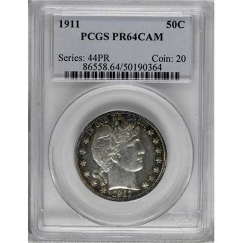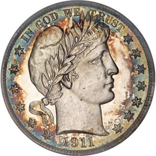 <B>1911 50C PR64 Cameo PCGS.</B></I> Lovely peripheral toning in shades of gold, citrine, maroon and aquamarine hug the rims, while the center, with its frosted devices, is nearly untoned. This effect makes the Cameo contrast noted on the PCGS insert especially dramatic. The fields show some scattered hairlines including a single hairline scratch on Liberty's cheek that limits the grade.<BR><BR><b>Shipping:</b> Coins & Currency (<a target="_blank" href="http://www.heritageauctions.com/common/shipping.php">view shipping information</a>)