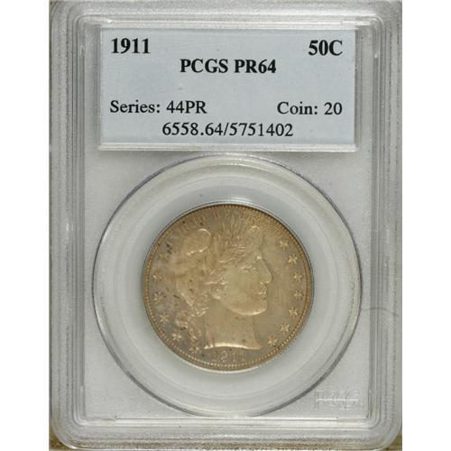 <B>1911 50C PR64 PCGS.</B></I> An opaque layer of pinkish-gray color on the obverse is interrupted by scattered brown spots. The reverse displays deep mirror fields and richly frosted devices, with minor cloudiness on the lower half. Sharply struck and free of handling marks. Population: 56 in 64, 47 finer (1/07).<BR><BR><b>Shipping:</b> Coins & Currency (<a target="_blank" href="http://www.heritageauctions.com/common/shipping.php">view shipping information</a>)