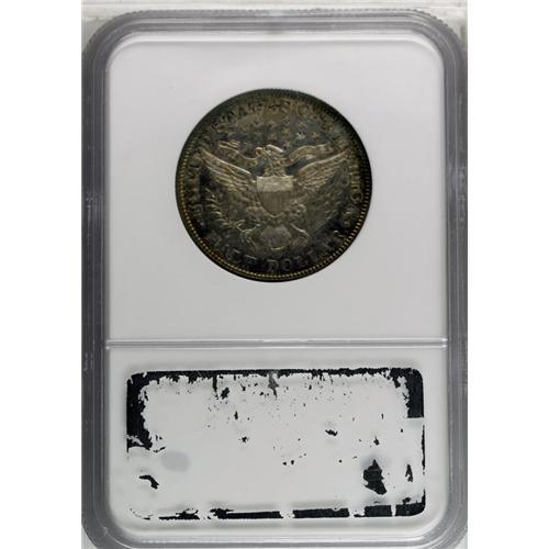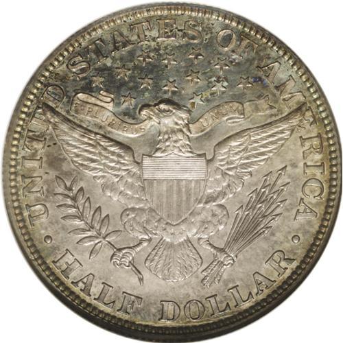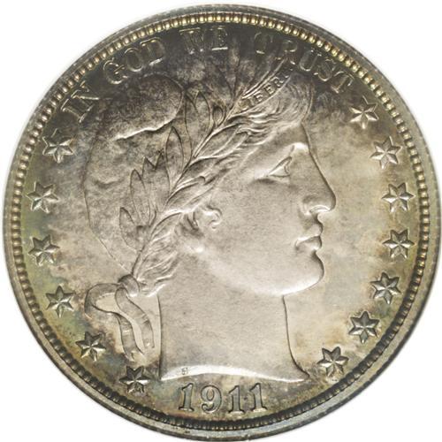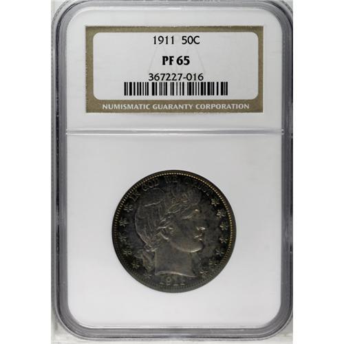 <B>1911<50C> PR65 NGC.</B></I> A lovely Gem specimen for the date collector who appreciates dappled blue and gold peripheral toning. Sharply struck on the obverse, and the claws and fletchings are also intricate. A trace of softness on the right (facing) wing near the shield is the only sign of strike incompleteness. A scant 543 proofs were struck. Census: 33 in 65, 42 finer (6/06).