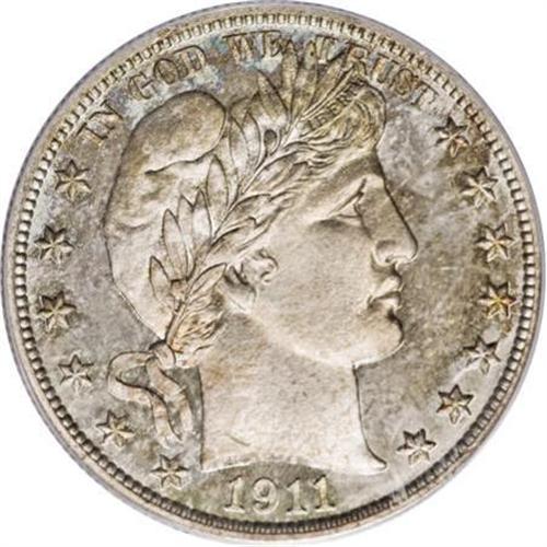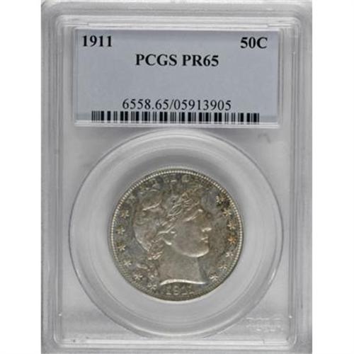 <B>1911 50C PR65 PCGS.</B></I> Layers of original olive, gold, rose, and sky-blue patina adorn the surfaces of this lovely Gem proof half dollar. Fully struck and nicely preserved, with a couple of faint slide marks noted on Liberty's cheek and a minor handling mark on the lower bust, just above Barber's initial. A conditionally scarce offering from a low mintage of 543 pieces. Population: 27 in 65, 22 finer (8/07). <BR><BR><B>Coin Engraver:</B> Charles E. Barber<BR><BR><b>Shipping:</b> Coins & Currency (<a target="_blank" href="http://www.heritageauctions.com/common/shipping.php">view shipping information</a>)