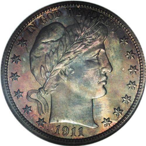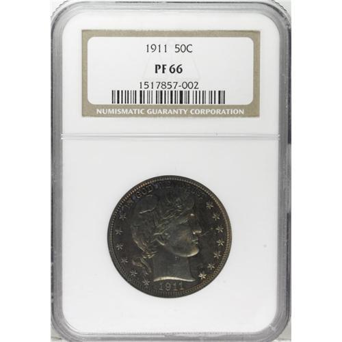 <B>1911 50C PR66 NGC.</B></I> A high quality proof representative that defies any preconceptions about rich layers of color having an adverse affect on a coin's mirrored qualities. This specimen is cloaked in forest-green and autumn-gold toning, yet provides considerable sparkle when held under a light. Census: 24 in 66, 18 finer (12/06).<BR><BR><b>Shipping:</b> Coin/Currency (<a target="_blank" href="http://www.heritageauctions.com/common/shipping.php">view shipping information</a>)
