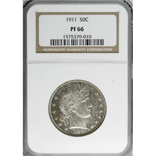 <B>1911 50C PR66 NGC.</B></I> This is a marvelous Premium Gem proof Barber half dollar that will delight the connoisseur of original toning. Speckled reddish-brown and green patina covers both sides. The design elements are fully struck and the glassy fields are highly reflective. An immaculately preserved example of this conditionally scarce item. Census: 26 in 66, 18 finer (6/07). <BR><BR><b>Shipping:</b> Coins & Currency (<a target="_blank" href="http://www.heritageauctions.com/common/shipping.php">view shipping information</a>)