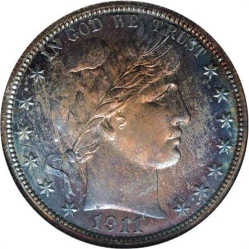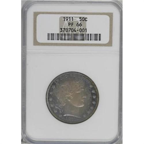 <B>1911 50C PR66 NGC.</B></I> Deep layers of violet, sky-blue, and apple-green toning adorn both sides of this lovely Premium Gem proof. Razor-sharp striking details attest to the care with which this piece was produced. Not many proof Barber halves can offer a level of eye appeal to compete with this gorgeous specimen. Population: 12 in 66, 10 finer (8/07). <BR><BR><B>Coin Engraver:</B> Charles E. Barber<BR><BR><b>Shipping:</b> Coins & Currency (<a target="_blank" href="http://www.heritageauctions.com/common/shipping.php">view shipping information</a>)