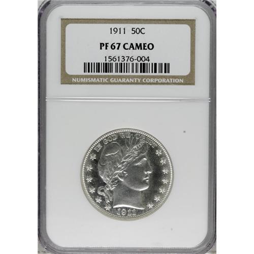 <B>1911 50C PR67 Cameo NGC.</B></I> Only 543 proof halves were produced in 1911, the third-lowest proof mintage in the Barber series. This beautiful Superb Gem is fully and crisply struck, with razor-sharp definition noted on all of the design elements. The deep mirror fields and snow-white frosted devices allow stark cameo contrast to be seen on both sides. Census: 4 in 67 Cameo, 0 finer (4/07).<BR><BR><b>Shipping:</b> Coins & Currency (<a target="_blank" href="http://www.heritageauctions.com/common/shipping.php">view shipping information</a>)