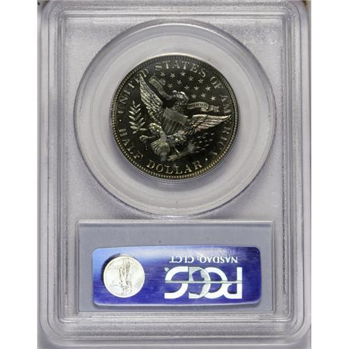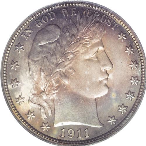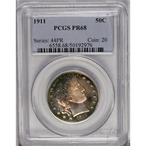 <B>1911<50C> PR68 PCGS.</B></I> Barber halves (as well as Barber dimes and quarters) are among the issues that today's host numismatic market has left severely underrated. This incredible Superb Gem proof coin represents an opportunity to acquire a piece of the <I>crème de la crème</B></I> of this series in terms of condition, if not in terms of absolute rarity. The obverse boasts a vibrant yet discreet iridescent color palette of cerise, heather, and lilac, while the reverse offers an intense, deep and consistent bluish-green. Extensive perusal under a high-powered loupe fails to reveal any evidence of post-strike contact on this luscious and delectably well preserved piece. Population: 4 in 68, 0 finer (7/06).