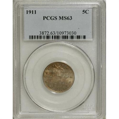<B>1911 5C MS63 PCGS.</B></I> PCGS Population (270/628). NGC Census: (249/558). Mintage: 39,559,372. Numismedia Wsl. Price for NGC/PCGS coin in MS63: $92. (#3872)<BR><BR><B>Coin Engraver:</B> Charles E. Barber<BR><BR><b>Shipping:</b> Coins & Currency (<a target="_blank" href="http://www.heritageauctions.com/common/shipping.php">view shipping information</a>)