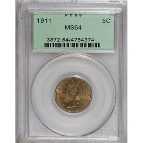 <B>1911 5C MS64 PCGS.</B></I> PCGS Population (423/212). NGC Census: (382/176). Mintage: 39,559,372. Numismedia Wsl. Price for NGC/PCGS coin in MS64: $180. (#3872)<BR><BR><B>Coin Engraver:</B> Charles E. Barber<BR><BR><b>Shipping:</b> Coins & Currency (<a target="_blank" href="http://www.heritageauctions.com/common/shipping.php">view shipping information</a>)