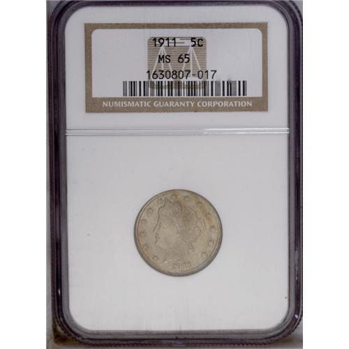 <B>1911 5C MS65 NGC.</B></I> Frosty mixed steel-gray and sunset-orange toning graces this attractive example. Scrutiny reveals a couple of toning flecks, and the left ear of corn is weakly struck. Nonetheless attractive and desirable. NGC has graded 26 finer (12/05).