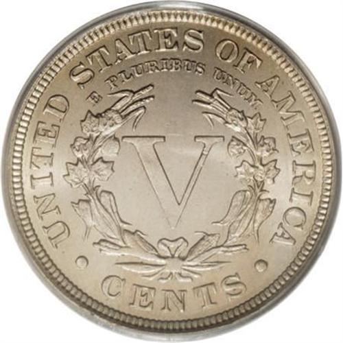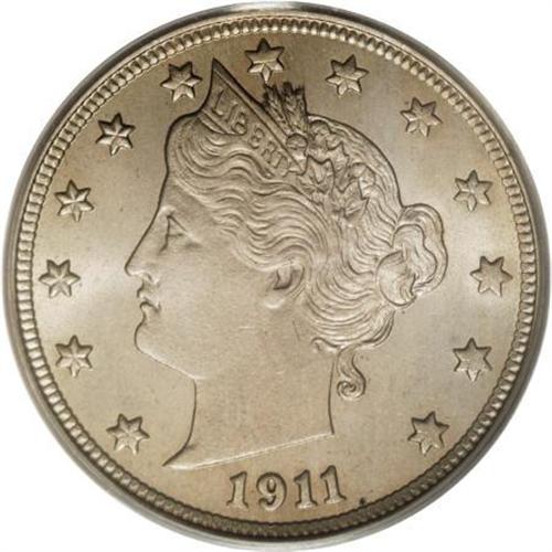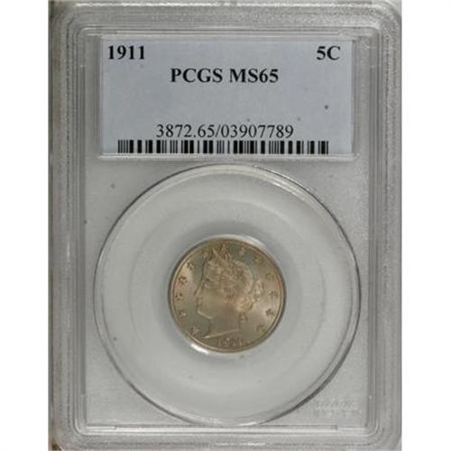 <B>1911 5C MS65 PCGS.</B></I> Champagne-gold patination is imbued with hints of sky-blue, and covers lustrous surfaces. Well struck, save for minor softness in some of the leaves left of the bowknot. There are no significant marks on either side.<BR><BR><b>Shipping:</b> Coins & Currency (<a target="_blank" href="http://www.heritageauctions.com/common/shipping.php">view shipping information</a>)
