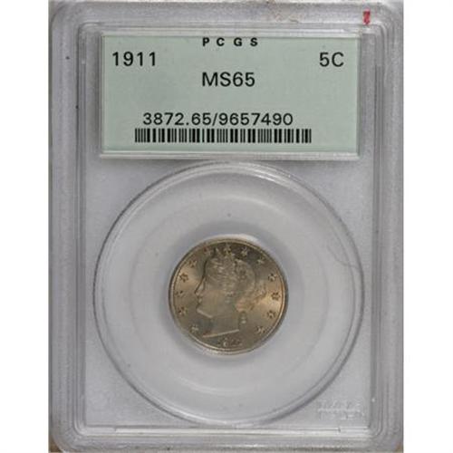 <B>1911 5C MS65 PCGS.</B></I> PCGS Population (171/34). NGC Census: (154/22). Mintage: 39,559,372. Numismedia Wsl. Price for NGC/PCGS coin in MS65: $560. (#3872)<BR><BR><B>Coin Engraver:</B> Charles E. Barber<BR><BR><b>Shipping:</b> Coins & Currency (<a target="_blank" href="http://www.heritageauctions.com/common/shipping.php">view shipping information</a>\)