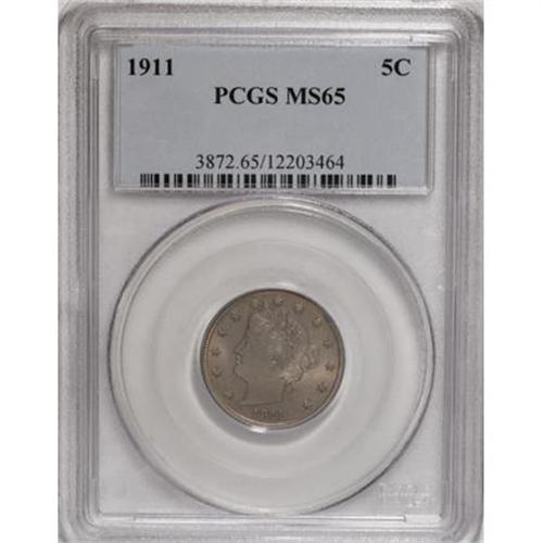 <B>1911 5C MS65 PCGS.</B></I> Soft beige-gray patina bathes the highly lustrous surfaces of this attractive Gem, and an attentive strike brings out strong definition on the devices, except for the usual softness on the elements immediately left of the bowknot. A well preserved piece.<BR><I>From The John Stimson, Sr. Collection, Part Two.</B></I><BR><BR><B>Coin Engraver:</B> Charles E. Barber<BR><BR><b>Shipping:</b> Coins & Currency (<a target="_blank" href="http://www.heritageauctions.com/common/shipping.php">view shipping information</a>)