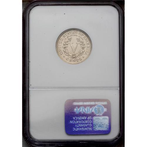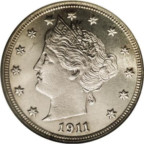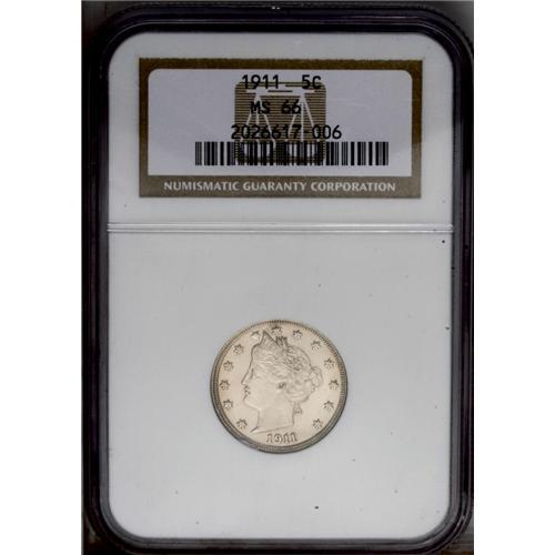 <B>1911<5C> MS66 NGC.</B></I> Intense mint luster that is most impressive for a nickel product, with soft golden toning lightening only in the center of the obverse and reverse. All details are especially well struck including the bow knot and the ear of corn on the reverse. A tiny luster graze is reported below stars 4 and 5 in the left obverse field. Census: 25 in 66, 1 finer (2/06).
