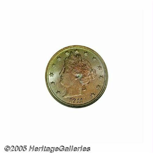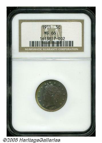 <B>1911<5C> MS66 NGC.</B></I> Pastel lilac, amber, and green toning over satiny luster with virtually perfect surfaces. It is only after careful examination that the grade-limiting surface marks are seen. This is a remarkable example with sharp design features and excellent eye appeal. NGC has only certified one finer Mint State example of this date. Population: 25 in 66, 1 finer (5/05).