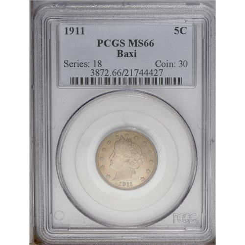 1911 5C MS66 PCGS. Light champagne, green, and crimson 1911[5C] MS66 PCGS.