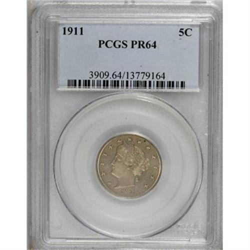 <B>1911 5C PR64 PCGS.</B></I> PCGS Population (195/162). NGC Census: (159/252). Mintage: 1,733. Numismedia Wsl. Price for NGC/PCGS coin in PR64: $250. (#3909)<BR><BR><B>Coin Engraver:</B> Charles E. Barber<BR><BR><b>Shipping:</b> Coins & Currency (<a target="_blank" href="http://www.heritageauctions.com/common/shipping.php">view shipping information</a>)