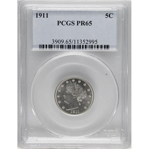 <B>1911 5C PR65 PCGS.</B></I> Crisply defined motifs and immaculate preservation are the major attributes of this lovely Gem. A light coating of milky-white patina over each side gives the piece a somewhat matte-like appearance.<BR><BR><b>Shipping:</b> Coins & Currency (<a target="_blank" href="http://www.heritageauctions.com/common/shipping.php">view shipping information</a>)