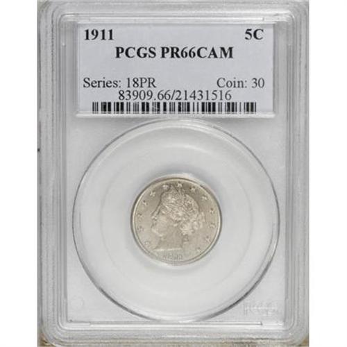<B>1911 5C PR66 Cameo PCGS.</B></I> Deeply mirrored with noticeable contrast. Variegated golden-gray and ice-blue toning. A small spot separates the TE in STATES. Population: 24 in 66 Cameo, 7 finer (11/07).<BR><BR><b>Shipping:</b> Coins & Currency (<a target="_blank" href="http://www.heritageauctions.com/common/shipping.php">view shipping information</a>)