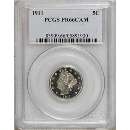 <B>1911 5C PR66 Cameo PCGS. CAC.</B></I> Delicate lemon-yellow accents visit the obverse, while the remainder of the coin is essentially untoned. Sharply struck with easily appreciable contrast and remarkable preservation. Population: 22 in 66 Cameo, 7 finer (12/07).<BR><BR><b>Shipping:</b> Coins & Currency (<a target="_blank" href="http://www.heritageauctions.com/common/shipping.php">view shipping information</a>)