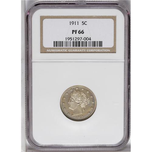 <B>1911<5C> PR66 NGC.</B></I> The smooth surfaces display lovely crescents of pastel coloration on both sides. The design features are fully struck and even the reverse left ear of corn shows complete definition. Exquisitely preserved and pristine, a beautiful Premium Gem proof. Census: 95 in 66, 16 finer (8/06).