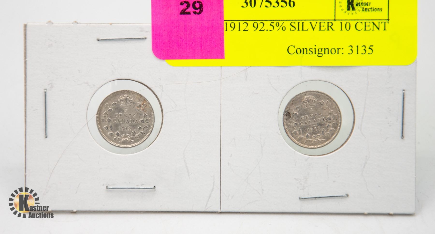 1911 AND 1912 92.5% SILVER 10 CENT CANADA