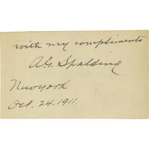<B>1911 Albert Spalding Signed Cut Signature.</B></I> Though a forty dollar per week contract in 1867 technically secured seventeen-year old A.G. Spalding's services as a clerk, more truthfully he was recruited to play for the Chicago Excelsior baseball team, making him one of the sport's first professionals. Still a household name today for the sporting goods empire he began, Spalding is enshrined at Cooperstown as one of the game's most noteworthy pioneers. Now, almost a century since his passing, most Hall of Fame autograph collections find him absent, and we're happy to remedy this problem for one lucky winning bidder. This 3x5" clipping was snipped from a handwritten letter, and reads, "with my compliments, A.G. Spalding, New York, Oct. 24, 1911." Black fountain pen ink is 9+/10, and the paper that houses it shows no flaws to note. <I>LOA from PSA/DNA. LOA from James Spence Authentication.</B></I><BR><BR><b>Shipping:</b> Flat Material, Small (<a target="_blank" href="http://www.heritageauctions.com/common/shipping.php">view shipping information</a>)