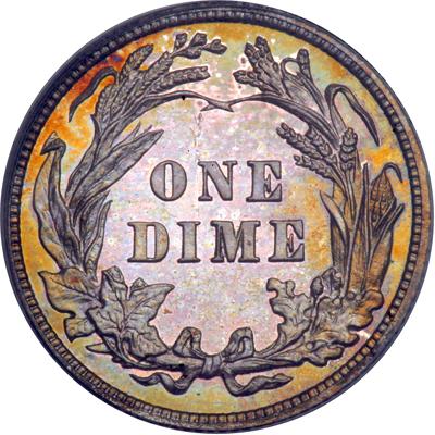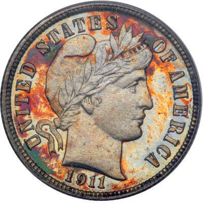 1911 Barber Dime. PCGS graded Proof 67 PQ. Lovely rainbow toning. Only 543 Proofs struck. A simply exquisite Gem, the underlying brilliant mirror surfaces are layered in multicolor effects with full, frosty textured luster captured from the dies by the raised devices. Mathematically exact standards seen in the sharp centers, making this high-end Proof noteworthy since "average" detail in the key high points, such as leaves of Liberty's garland is more often the case. Pop 10; 5 in 68. (PCGS # 4895).