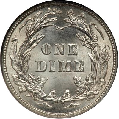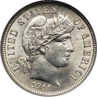 1911 Barber Dime. NGC graded MS-67. Frosty white coin. From center to periphery the intense radiant silvery luster glows superbly. Pop 11; 2 finer in 68.