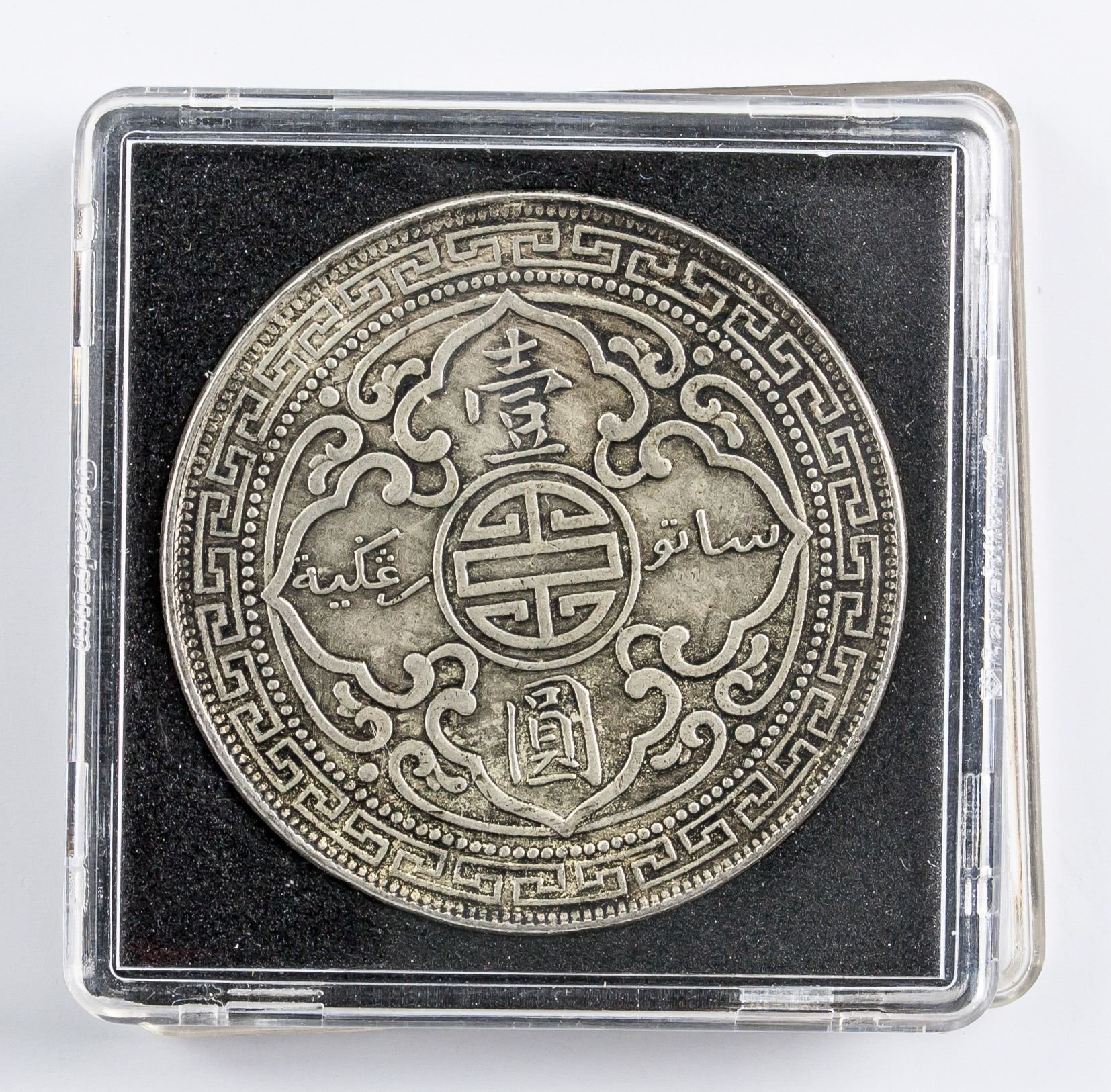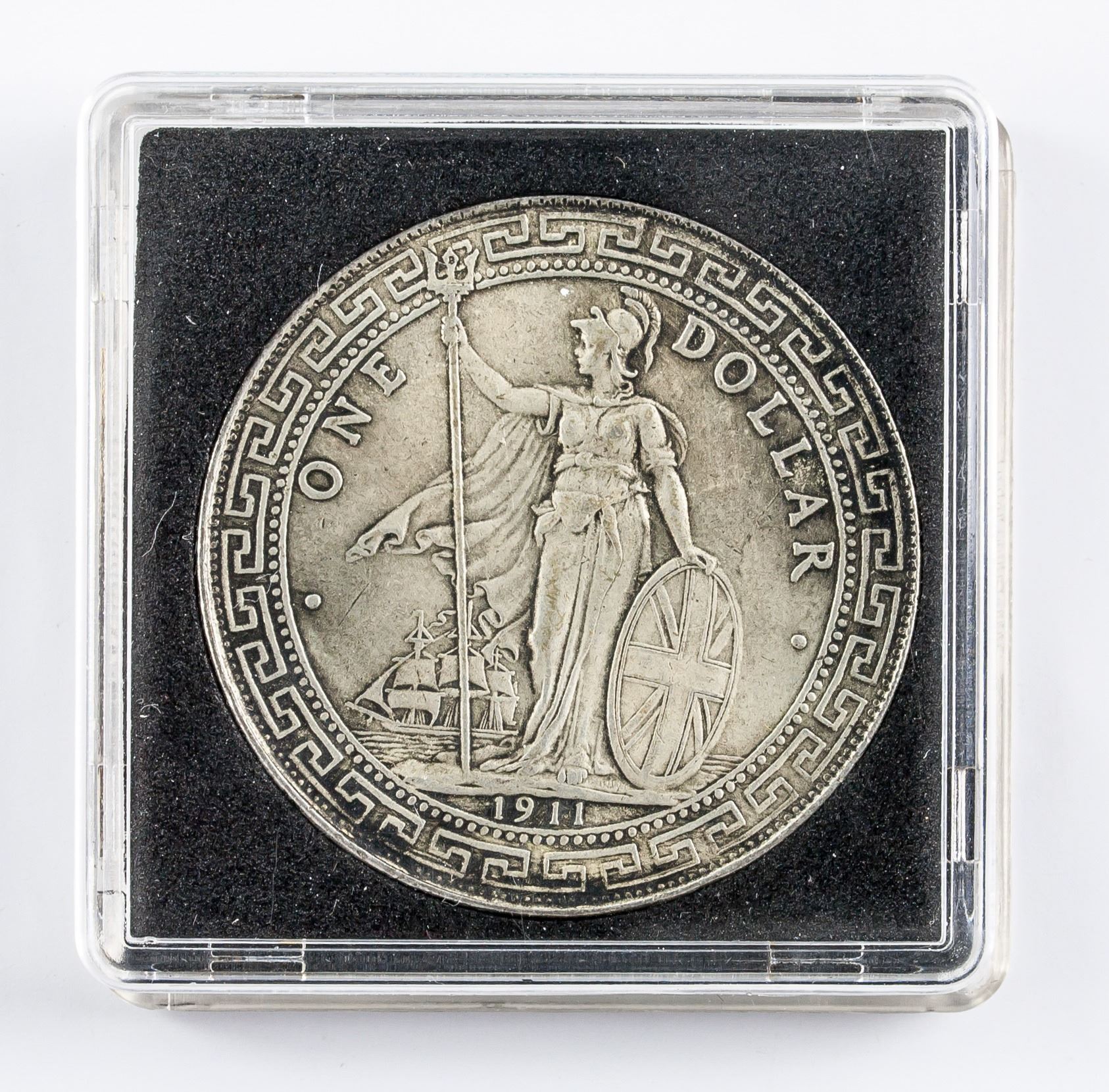 1911 British 1 dollar trade coin, obverse engraved standing figure of Britannia holding trident and shield with merchant ship in background, date in exergue, lettering ONE DOLLAR, 1911, reverse engraved ornamental flower, lettering Yi Yuan, reeded edge, KM-T5, Diameter: 3.9cm