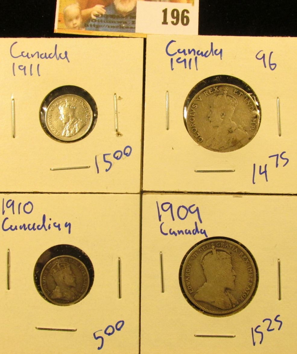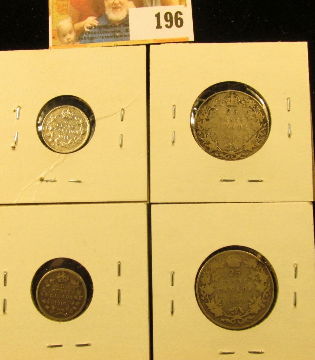 1911 CANDIAN SILVER 5 CENT PIECE, 1909 CANADIAN QUARTER, 1909 QUARTER, AND 1910 CANADIAN 5 CENT PIECE.